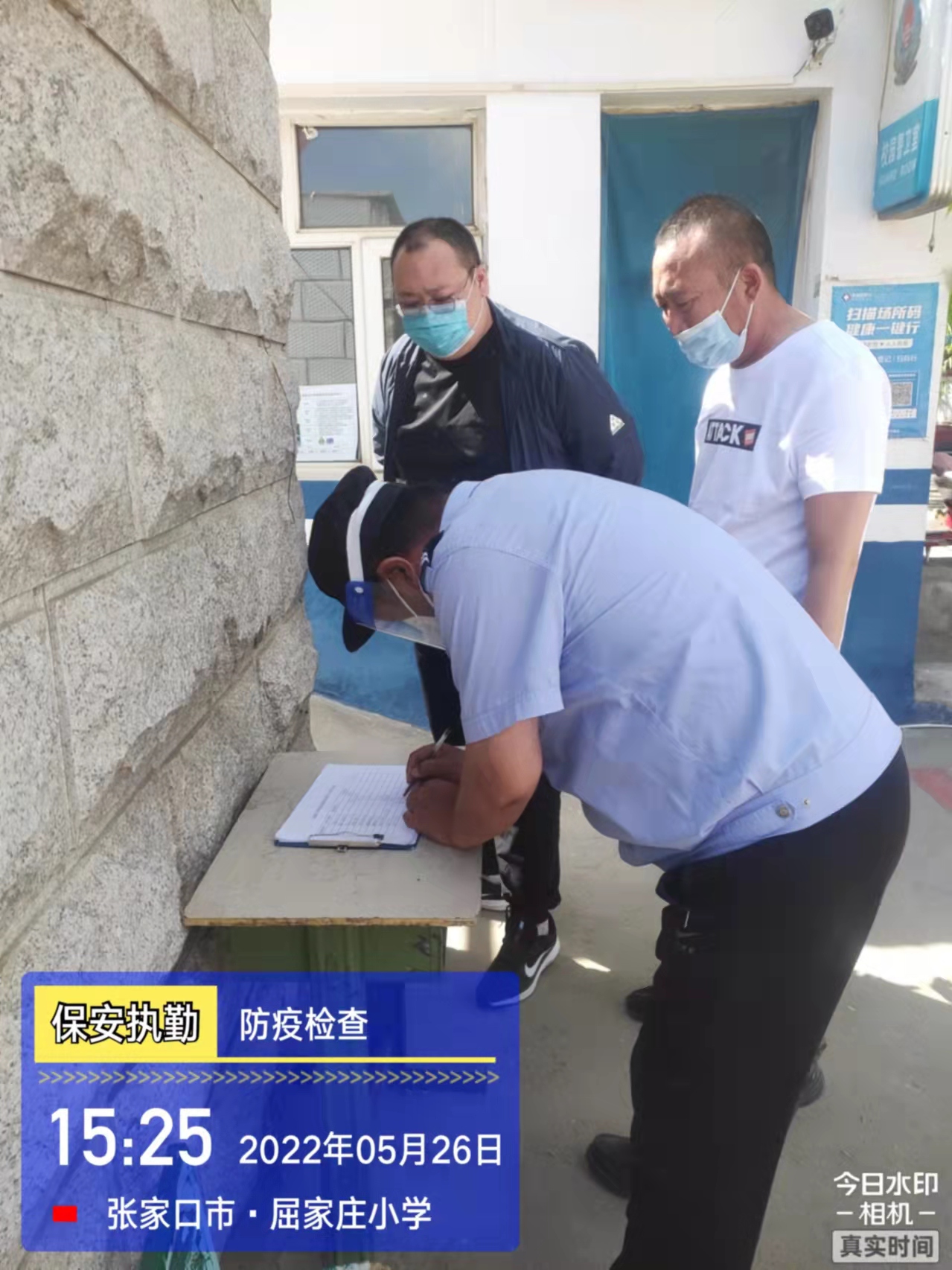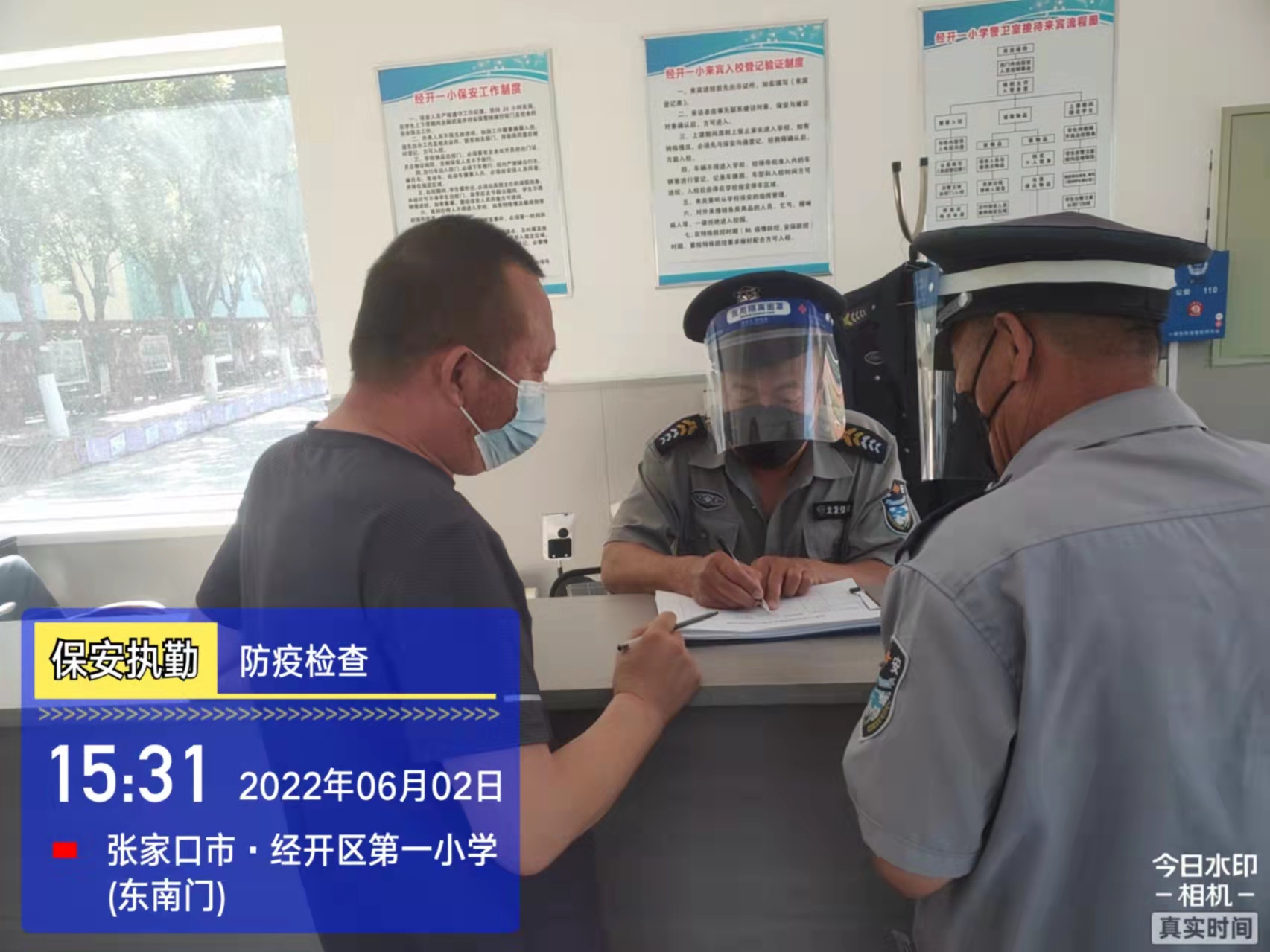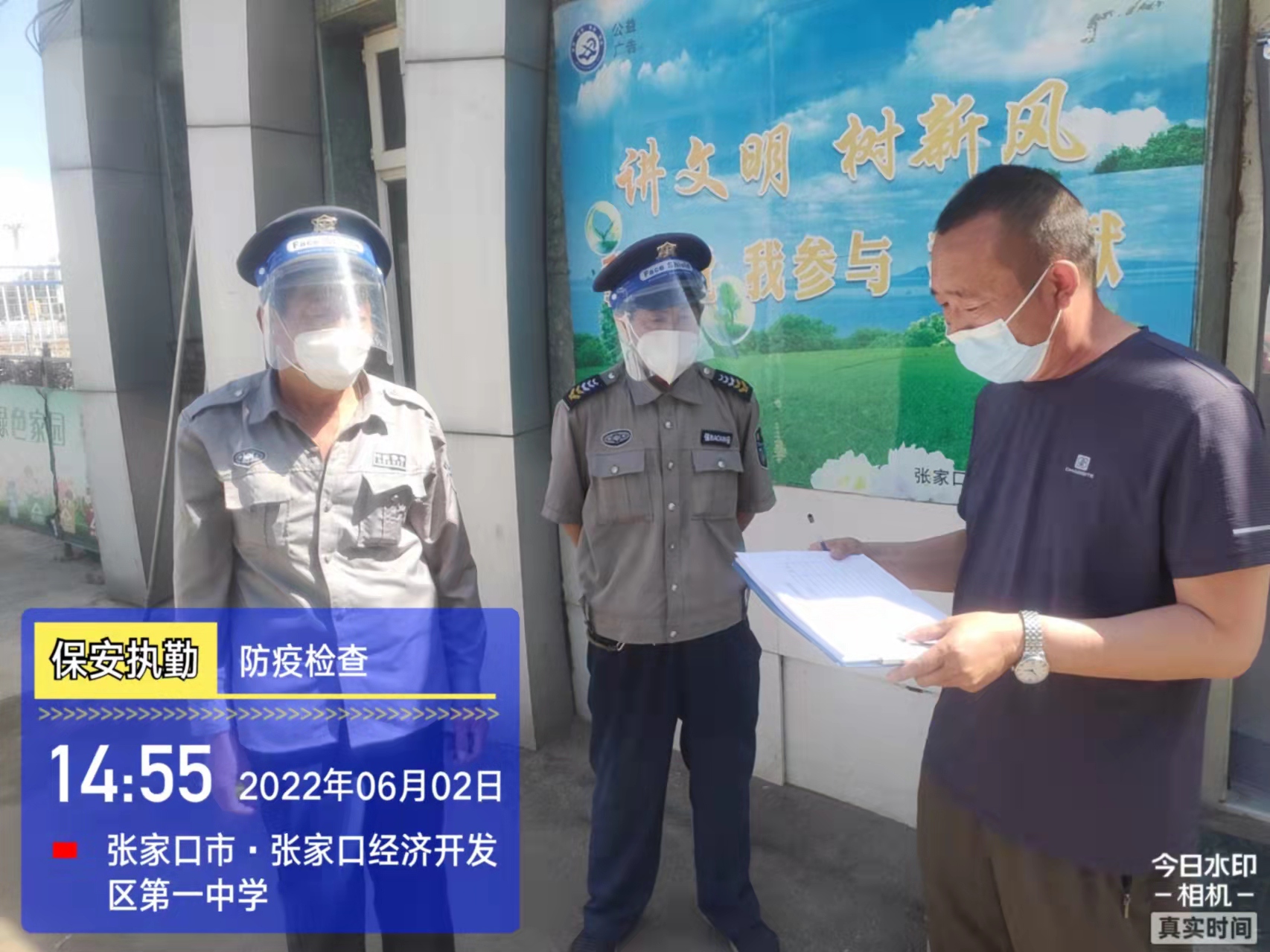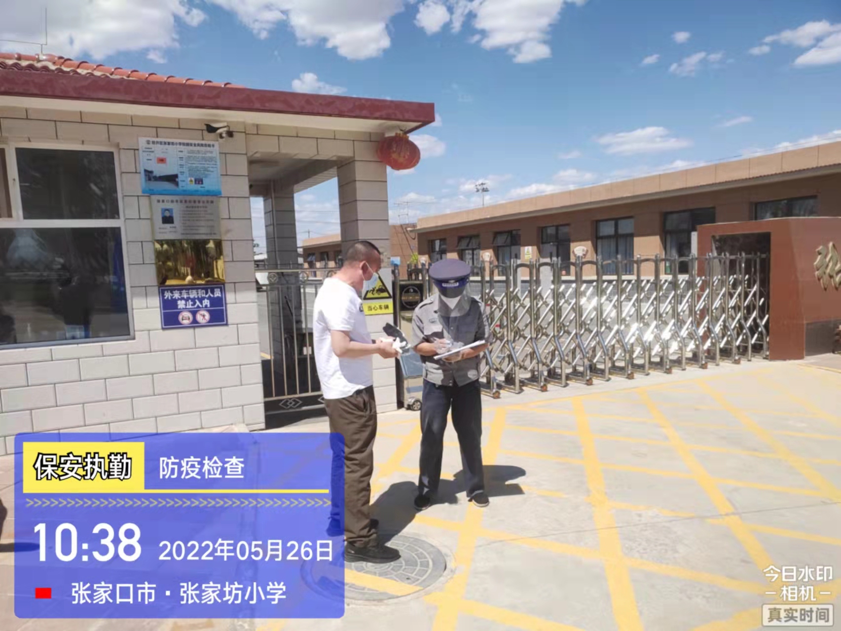 會后,我公司迅速召開“疫情期間學校門衛(wèi)安全防控工作要求”的會議,制定了校園安全防疫規(guī)定:疫情防控期間,校園保安隊員必須穿制服,規(guī)范佩戴“三件套”(防護隔離面罩、N95口罩、一次性PVC手套);進出校園的師生必須測量體溫,外來人員需登記、測溫、掃碼(幸福張家口,呈綠碼)、且持7日內(nèi)核酸陰性檢測結果;保安室需保持干凈整潔,物品擺放有序,勤開窗通風,定期噴灑消毒藥水。為此,公司特成立校園防疫檢查小組,由副經(jīng)理帶隊,協(xié)同主管大隊長對經(jīng)開區(qū)所有中小學校安保崗位進行防疫工作檢查,檢查期間,發(fā)現(xiàn)問題,現(xiàn)場處理,并及時與校方領導溝通,杜絕同樣問題再次出現(xiàn),確保校園防疫安保工作萬無一失,為各校師生鑄就一道安全防線!